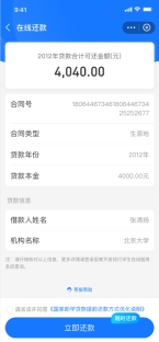 完成上述动作后,家长在国开行小程序在线还款页面输入贷款人的姓名和身份证号,即可帮助贷款人进行还款。