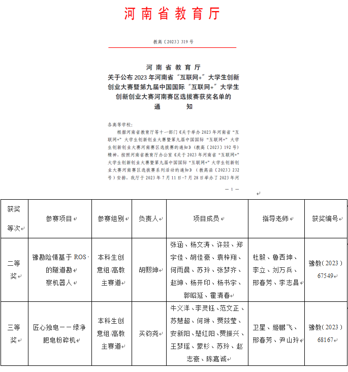 近日,2023年河南省“互联网+”老员工创新创业大赛暨第九届中国国际“互联网+”老员工创新创业大赛河南赛区选拔赛获奖名单公布,公司在本届大赛中获得优异成绩,由杜毅、卫星等老师指导的员工团队分别获得高教主赛道本科生创意组二等奖、三等奖。