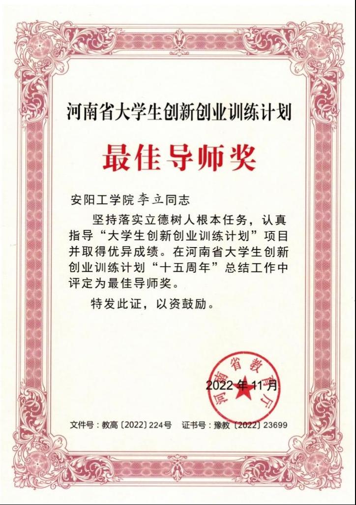 此次总结工作与荣誉表彰是河南省教育厅根据国家级老员工创新创业训练计划专家组《关于举办国家级老员工创新创业训练计划十五周年荣誉表彰的通知》精神组织开展的评选与表彰,全省共有包括公司李立老师在内的50名老师获得河南省老员工创新创业训练计划最佳导师奖。