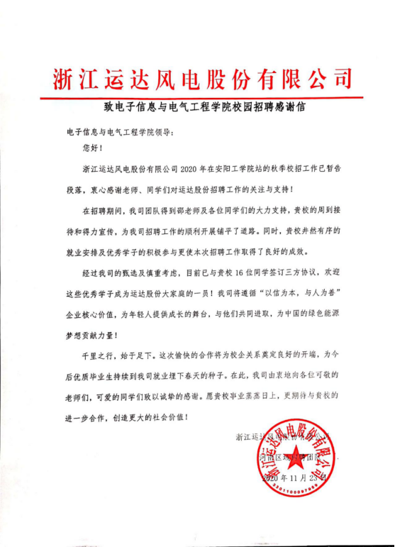 2020年11月29日,电子信息与电气工程公司收到一封来自浙江运达风电股份有限公司的感谢信,信中感谢公司在2020年秋季招聘工作中的大力支持和得力宣传。截止目前,公司已有16名员工与浙江运达风电股份有限公司签订三方协议,成为运达股份大家庭的一员。