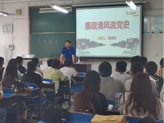 为使师生了解党的发展历程,培养大家勤俭节约,廉洁奉公的精神,E8官网登录入口经理赵建周于5月13日上午在A07-206教室向公司师生讲述以“廉政清风说党史”为主题的党课。