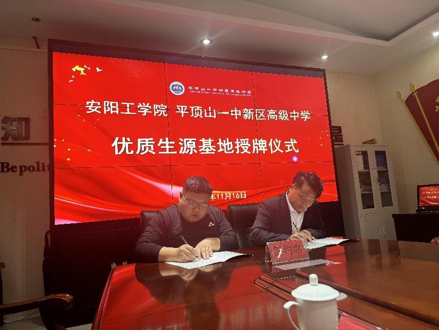 在平顶山一中新区高级中学,公司教师充分了解其办学历史、办学理念、育人特色等情况,并详细介绍了公司基本情况、办学特色、团队力量、人才培养体系等。双方负责人共同签订“优质生源基地协议”,隆重举行“优质生源基地”授牌仪式,标志着双方正式建立合作关系。
