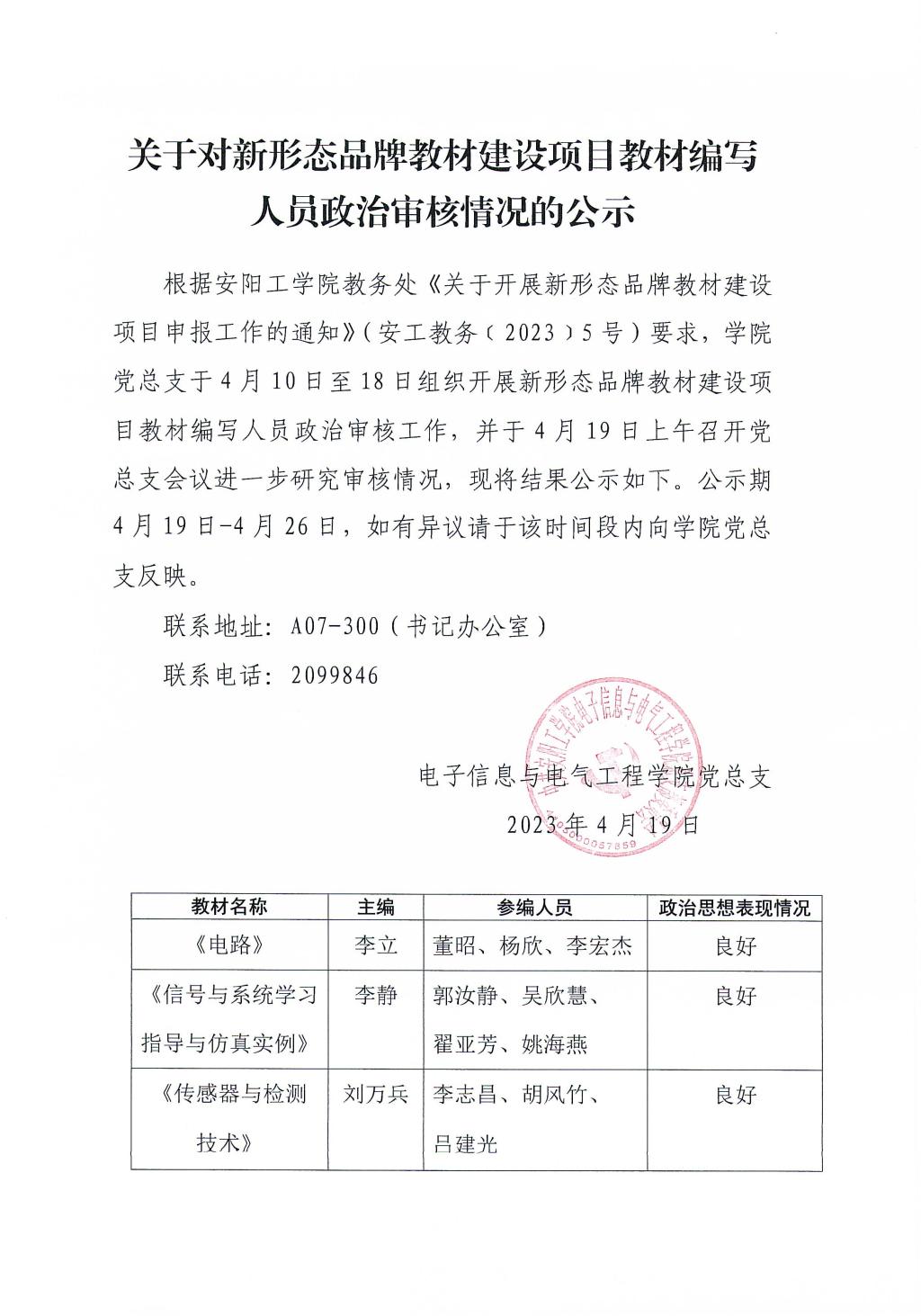 关于对新形态品牌教材建设项目教材编写人员政治审核情况的公示